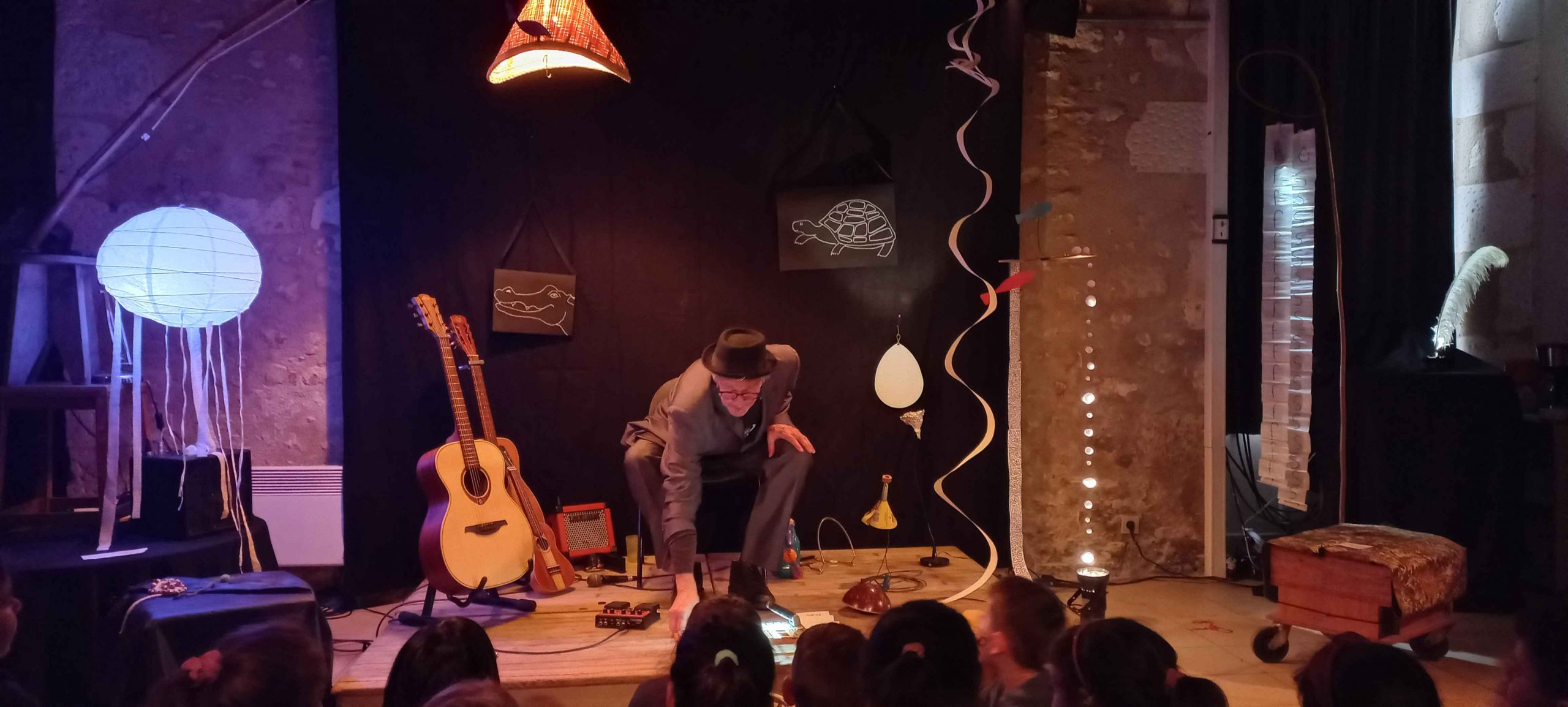 Pascal Pouvreau accompagne son chant en jouant avec des instruments acoustiques à cordes et petites percussions. Le déroulé du spectacle est ponctuée par la découverte d’illustrations de Valérie Fayoux qui habillent petit à petit, le décor minimaliste.